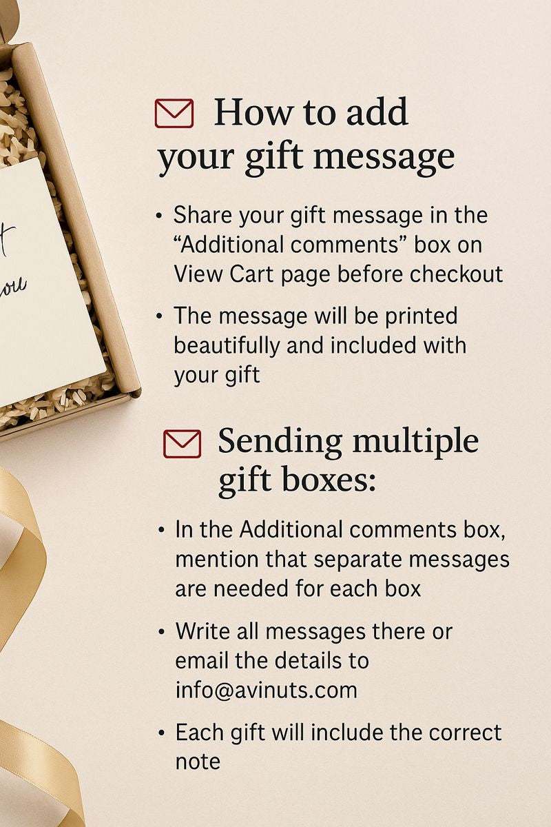 At AviNuts, every box is packed with joy, flavor, and a whole lot of love. Since we work with edible products, we follow strict food safety guidelines ā but weāre also big believers in good vibes and happy customers. Here's everything you need to know: